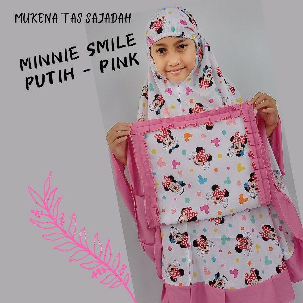 Harga Mukena Anak Kecil Karakter Minnie Smile Putih Pink Katun Adem Tas Sajadah Balita TK SD Terbaru 2022